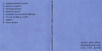 Description: Two-sided insert for slimline CD case for eight-song release by Pacific NW-based artist Peter Vidito (aka gorgon sound). Design involved layout and image manipulation. Release was used for promotional purposes in July 2002.