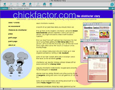 Description: Web site for chickfactor, a 'zine founded in 1992 by Pam Berry and Gail O'Hara. Site design conceptualized by LD Beghtol and executed in close collaboration with Gail O' in late 2002 continuing through the present. Site contains massive archives of all 15 issues of chickfactor, plus news, web exclusives, the CF shop, and an extensive image archive of CF events posters and photos.