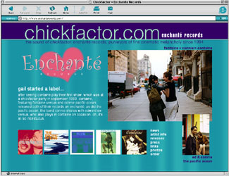 Visit site: enchanterecords.com Enchanté releases: I want it all (containe, 1994); only cowards walk like cowards (containe, 1997); birds don't think they're flying (the pacific ocean, 1998); less than the needle, more than the shotgun (the pacific ocean, 2000); all's fair in love and...chickfactor: cf mixtape 1 (various artists, 2002).