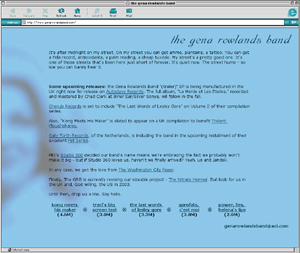Description: One-page web site for DC-based cinema-obsessed Gena Rowlands Band, fronted by ex-Telegraph Melts guitarist Bob Massey and featuring a rotating lineup of musicians including violinist Jean Cook (Edith Frost, Jenny Toomey). Site created in 2002 and featured news and MP3s. As of 2005, site has been redesigned and expanded by the artist and is no longer maintained by Autumnshades.com